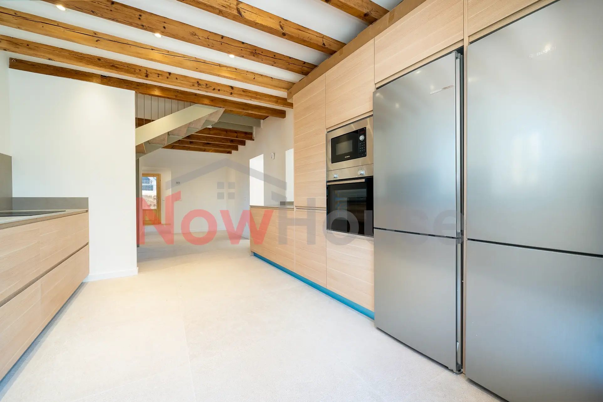 • Cocina totalmente equipada con electrodomésticos de última generación, elegante y funcional, en armonía con la estética blanca y madera de la vivienda.